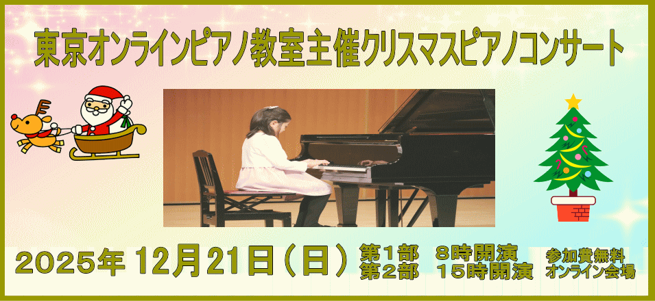 東京オンラインピアノ教室紹介動画![]() 東京オンラインピアノ教室は ピアノプライベートレッスンが 受け放題! 1レッスンが580円〜! 振替は自由で好きな時間に レッスンを受けられるから 忙しくても安心! 発表会は参加費無料! ![]() 【演奏会情報】 2025年12月21日(日) 東京オンラインピアノ教室主催 クリスマスピアノコンサート 2026年3月22日(日) 東京オンラインピアノ教室主催 スプリングピアノコンサート 日本全国・世界各国から ピアノの上達を目指す仲間が 集まっています 日本・アメリカ・オーストラリア カナダ・スイス・フランス ニュージーランド 香港・上海・台湾など (在籍生のお住まいの地域) ![]() 生徒さんの活躍 (2024年・2025年) Concerto Competition 合格おめでとう との共演おめでとう ピアノコンクール in ASIA 入賞おめでとう コンペティション 入賞おめでとう コンペティション 予選通過率100% ステップ 合格率100% 学習者グレード 合格率100% 入賞おめでとう 合格率100% |